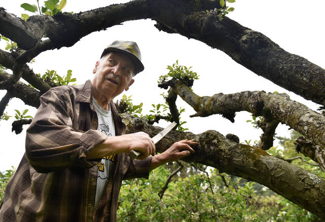 The tree is — pardon the pun — the apple of Kachmarsky’s eye. And as is the case with the tree, Kachmarsky, who will turn 89 in August, uses a wooden stick to help him navigate. He was wearing a T-shirt that read, “Pringle Hill, PA,” under his flannel shirt.