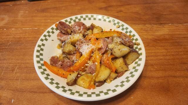 A meal made of kielbasa, potatoes, a red pepper, onion and a very tasty mix of seasoning capped with a dash of hot sauce.