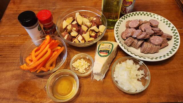 I wasn’t hungry that evening, so a few days later, there was the better part of the ring sitting in the fridge, and I decided to look for a new recipe that would combine kielbasa and some potatoes we also had sitting around for a while. This one caught my eye partly because the mix of ingredients sounded tasty, but also because it calls for a little chicken stock near the end, adding more flavor to the array of bell pepper, onion, garlic, hot sauce and Parmesan.