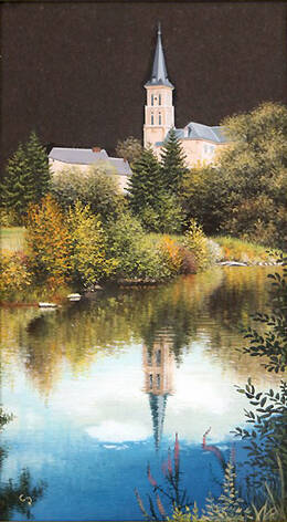One of the international members, Christian Ryzski of Belgium, has several paintings in the show, including the church with its steeple reflected in the water.