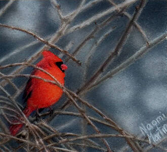 Martin is new to painting miniatures, and the vivid red cardinal she painted, titled “A Snowy Day,” won a Newbie Award from the Cider Painters.