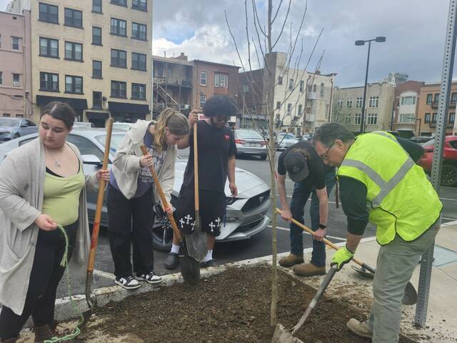 Working to plant a tree in downtown Wilkes-Barre on a recent Friday morning are Career and Technical Center students Nebula Newhart, Reily Mills, Danny Ortiz and David Johnson with urban forester Vinnie Cotrone.