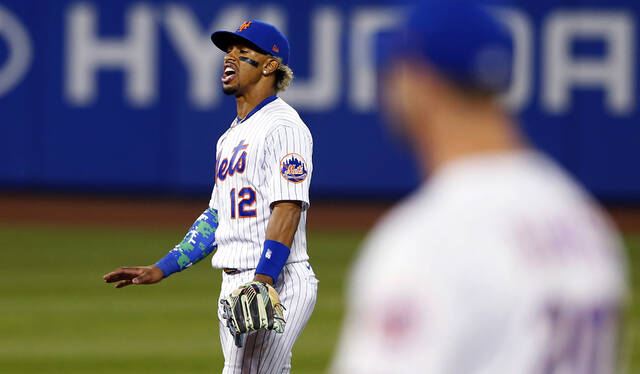 New York Mets short stop Francisco Lindor reacts after the New York Yankees’ Giancarlo Stanton hit a home run in the seventh inning of a game Sunday in New York.